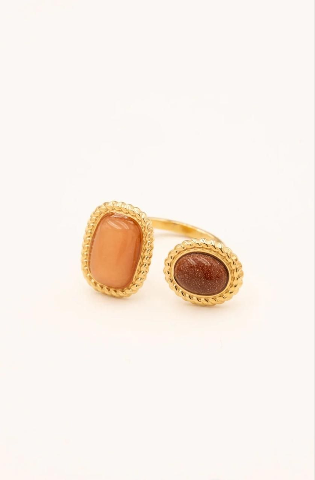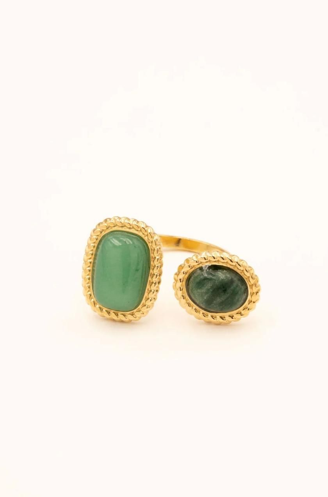 Bague large en acier inoxydable composée d'une ouverture à l'avant et de deux pierres naturelles sur un empiècement aux contours texturés.