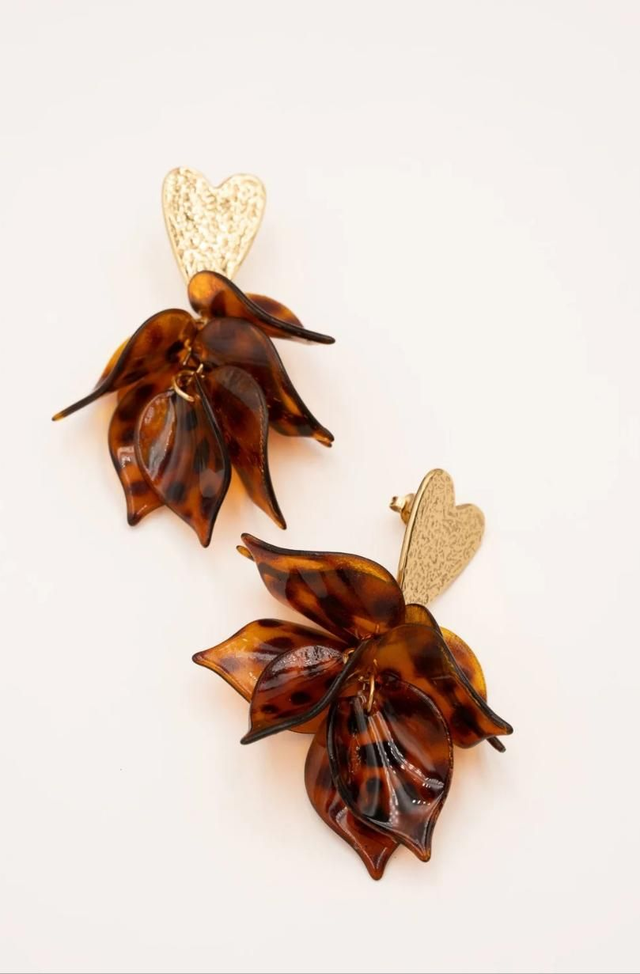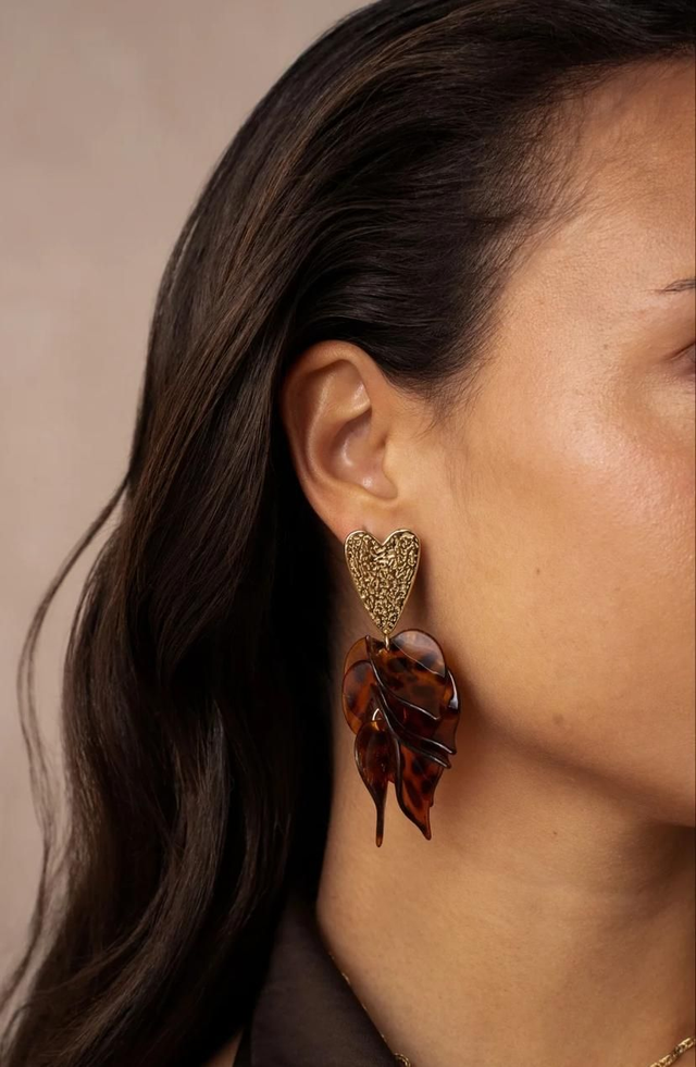 Boucles d'oreilles pendantes en acier inoxydable composées d'un coeur texturé et de pièces pendantes en acétate.
