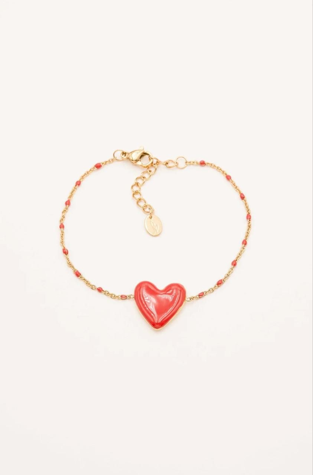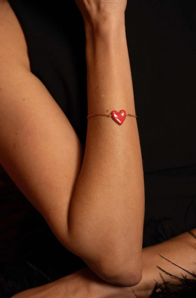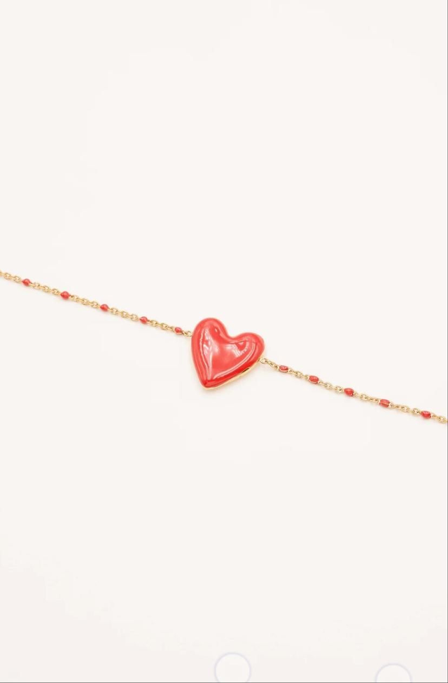 Bracelet sur chaîne en acier inoxydable composé d'une maille forçat aux touches rouges émaillées et d'un pendentif en forme de coeur en émail coloris rouge