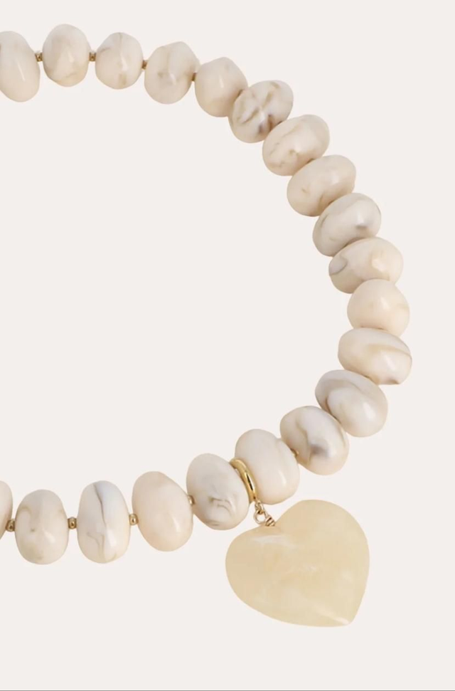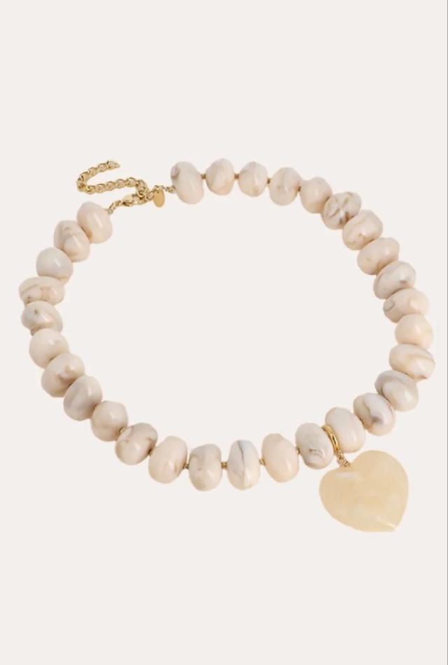 Collier sur cordon composé de grosses perles en résine colorée et d'un pendentif amovible en forme de coeur en résine.