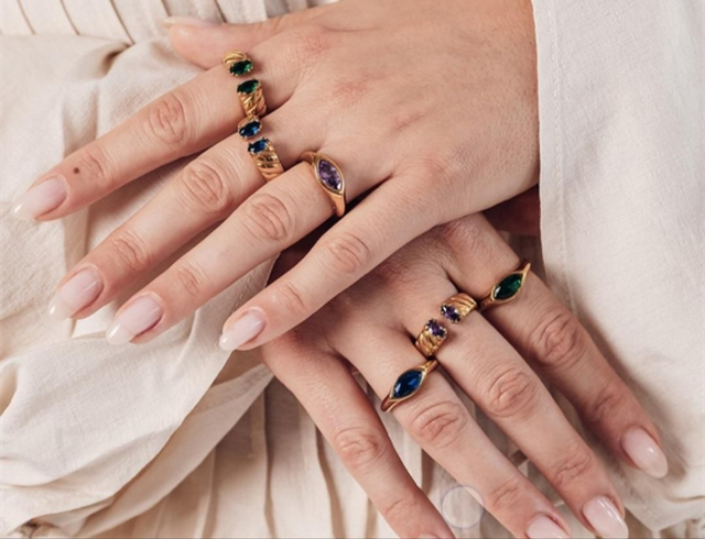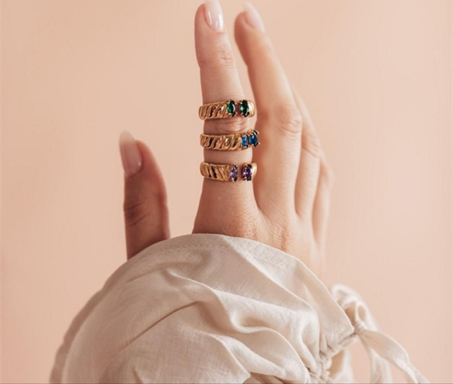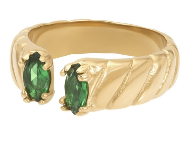 La bague a un design saisissant et comporte deux pierres de couleur émeraude sur le dessus.
